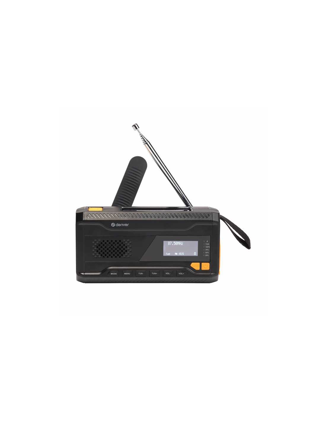 Hånddrevet Dynamo: Ved at dreje håndsvinget sikrer du hurtig og manuel strøm til radioen eller til at foretage et kort telefonopkald.